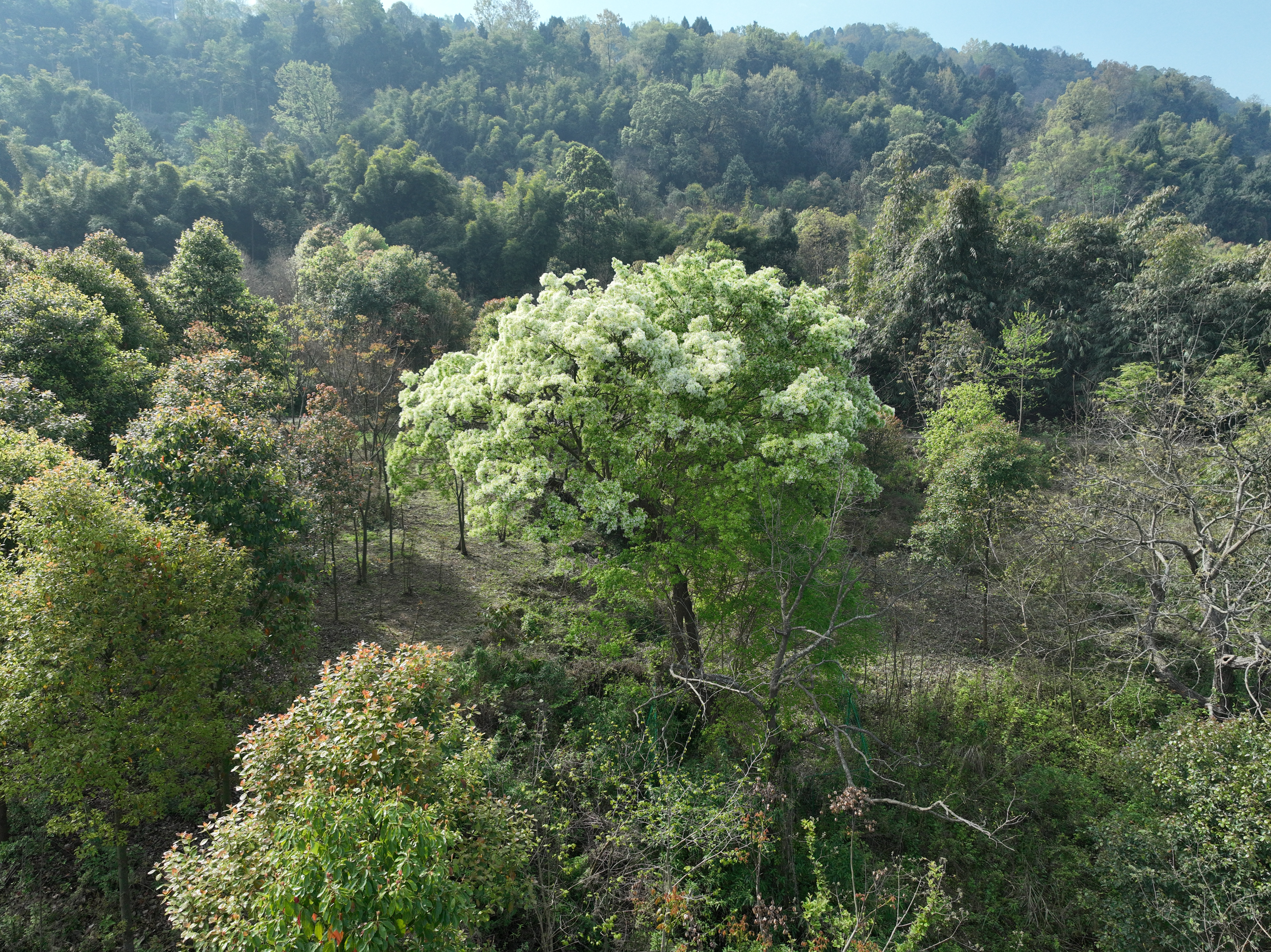 驱车自万兴老场口原公平村党群服务中心的岔路而下,沿一车宽的水泥路蜿蜒向山坳深处行去。约莫不到一公里光景,在竹林掩映的弯道尽头,小路左侧的山坳里,那一树白花便豁然映入眼帘——这,便是在深山里静静开落了两百余年的流苏树。