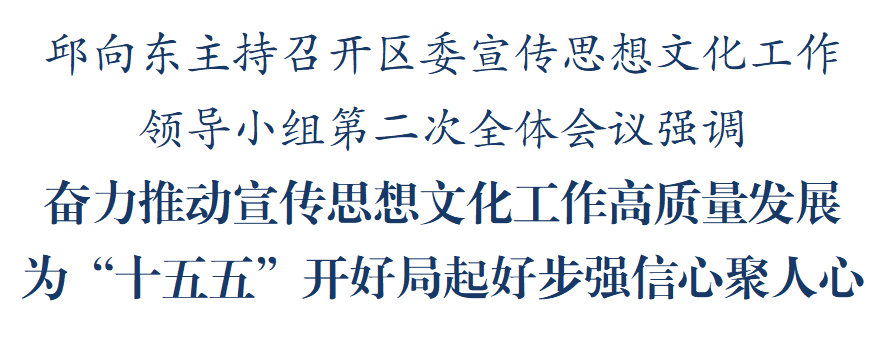 近日,十二届区委宣传思想文化工作领导小组第二次全体会议召开。区委书记、领导小组组长邱向东主持会议并讲话。他强调,要深入学习贯彻习近平文化思想,认真落实全国、全省、全市宣传部长会议精神,更好担负起新的文化使命,奋力推动宣传思想文化工作高质量发展,为“十五五”开好局起好步强信心、聚人心。