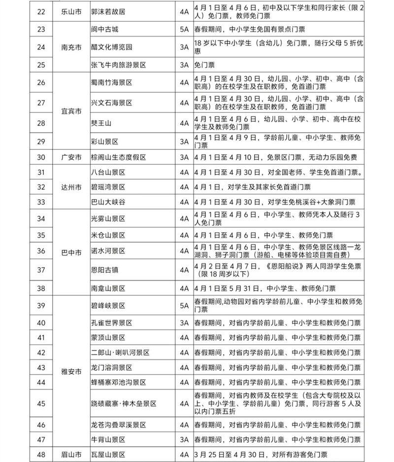其中,广元全市45家A级景区于4月1日至4月30日(清明节假期除外)面向全国全日制中小学生、幼儿园儿童、在职教师免门票,每名学生(儿童)随行的2名家长(或法定监护人)也可享受门票7折优惠;青城山-都江堰、海螺沟冰川森林公园等景区针对中小学生等特定群体实施免门票政策;瓦屋山景区、安岳石刻·圆觉洞、天府芙蓉园、黑水县卡龙沟等景区面向所有游客免门票。除100多家景区免门票以外,达古冰川、丹景台等部分景区也推出不同的门票优惠政策。