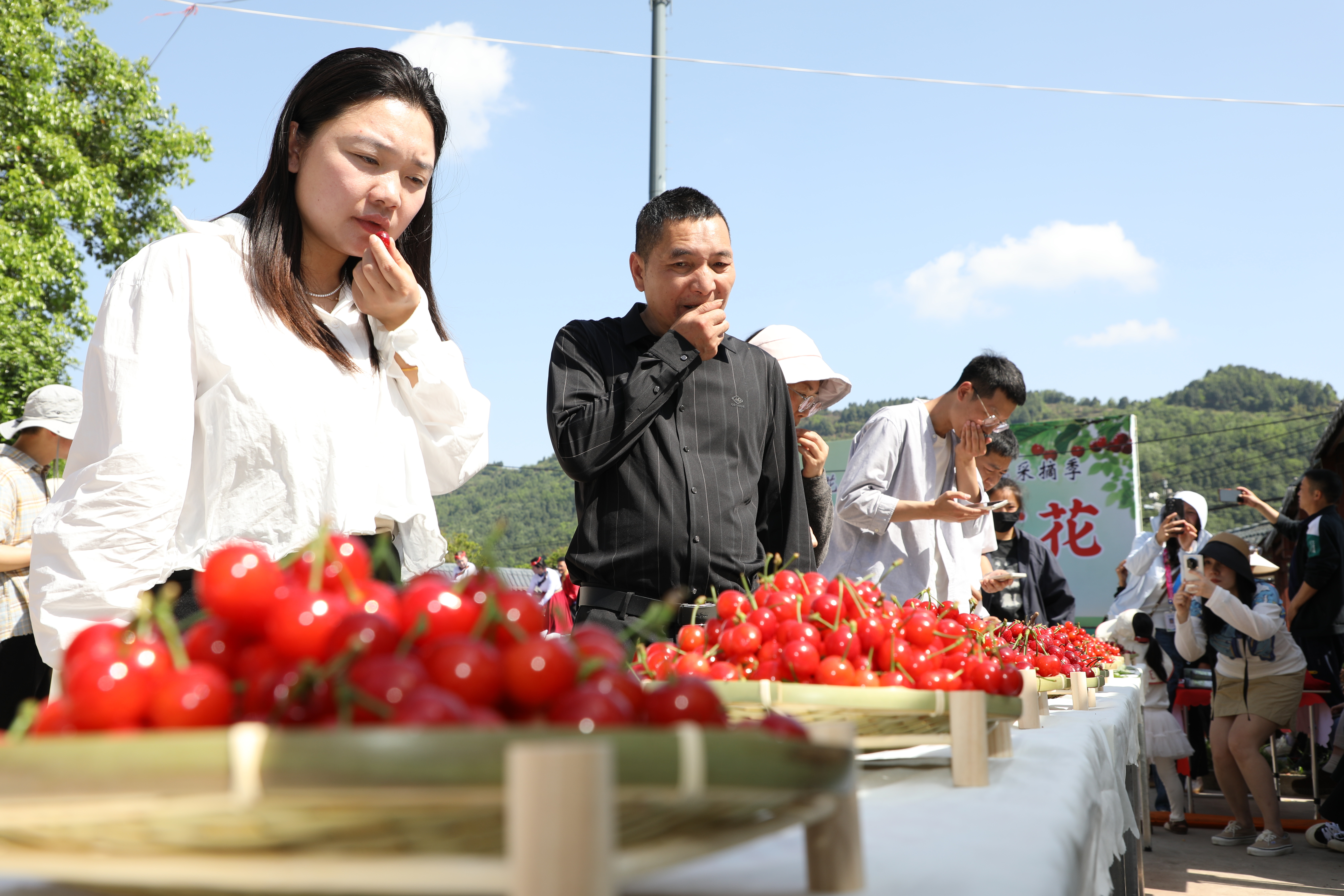 第二篇章 “樱香满谷・匠心品鉴”聚焦樱桃产业展示与沉浸式体验,打造集视觉、味觉、互动于一体的田园盛宴。活动现场设置“樱有尽有” 精品展示区,集中展出红妃、黑珍珠、大白樱等优质樱桃品种,以图文展板科普品种特性、口感甜度与成熟周期,让游客 “看樱识种、知樱懂樱”;“樱香雅集” 免费品鉴区由本地种植户设台,提供新鲜樱桃供游客免费品尝,同步开展 “樱桃大王” 评选 ,通过现场品鉴、公开投票,评选出年度优质樱桃奖项,激励果农提质管护、打造品牌;搭建直播平台,邀请本土网红、村干部现场直播推介、带货助农,游客可沉浸式体验主播角色;现场还发布“最美采摘路线”导览地图,为亲子游玩、拍照打卡、深度采摘提供精准指引,实现 “入园即体验、处处可打卡”。