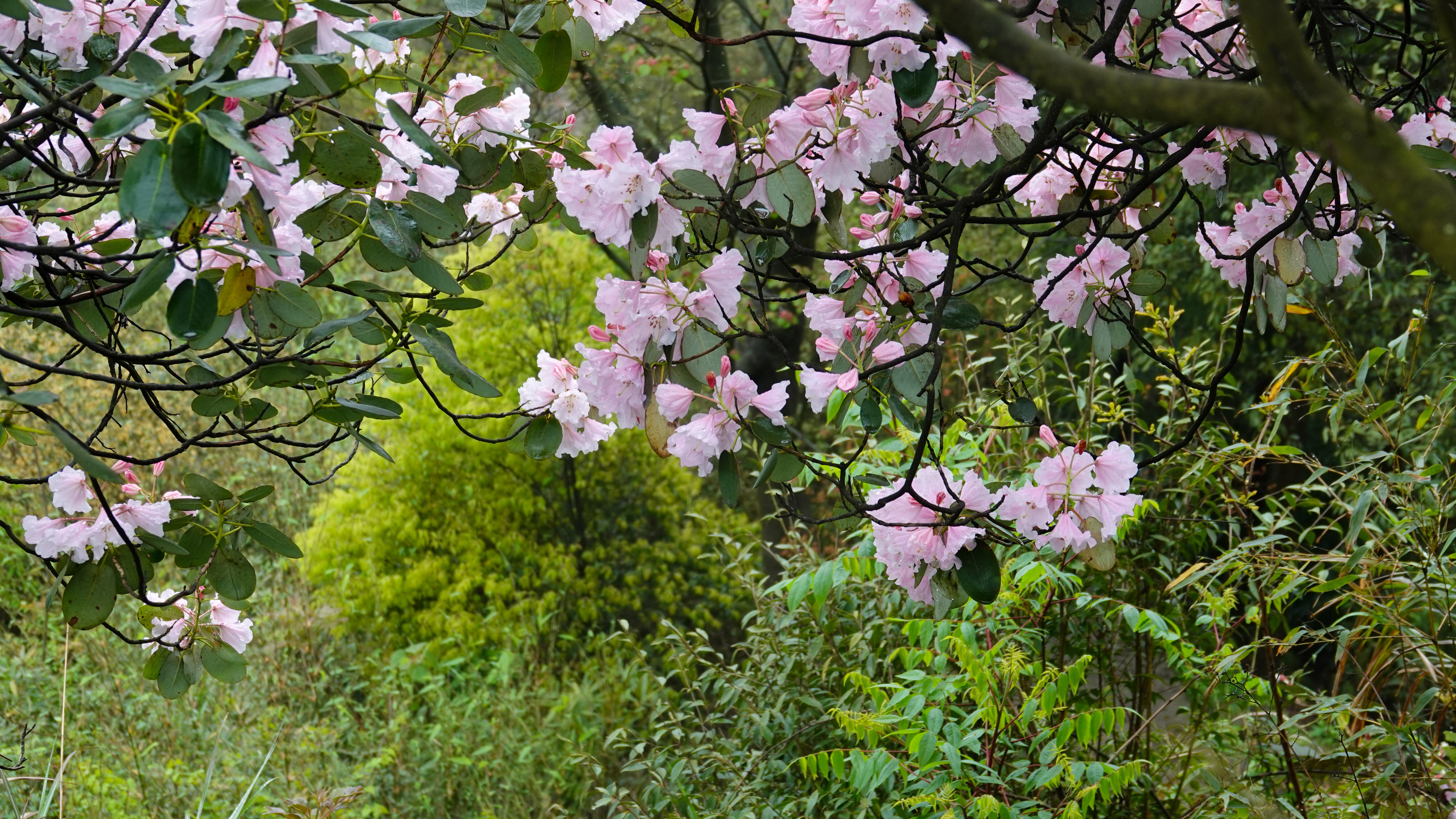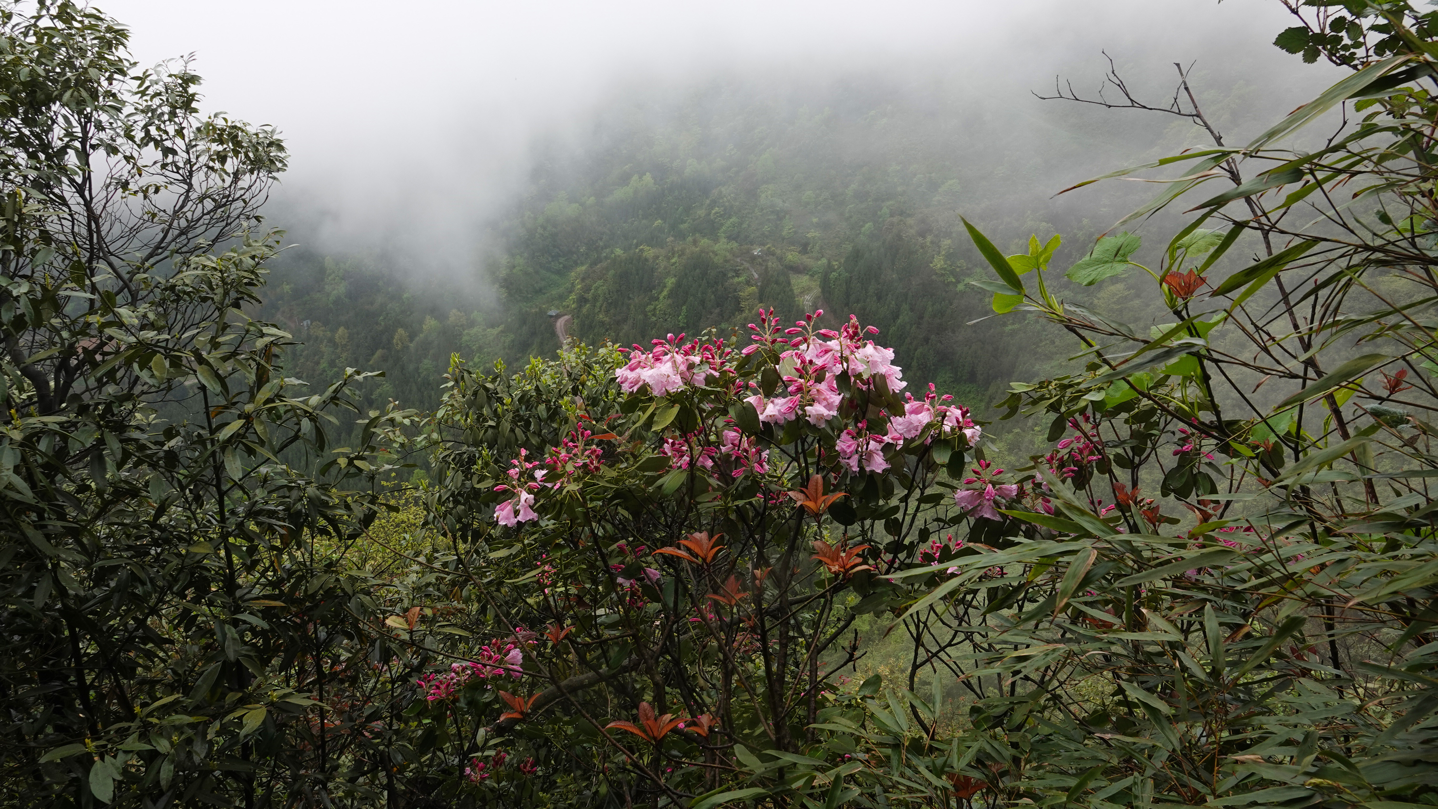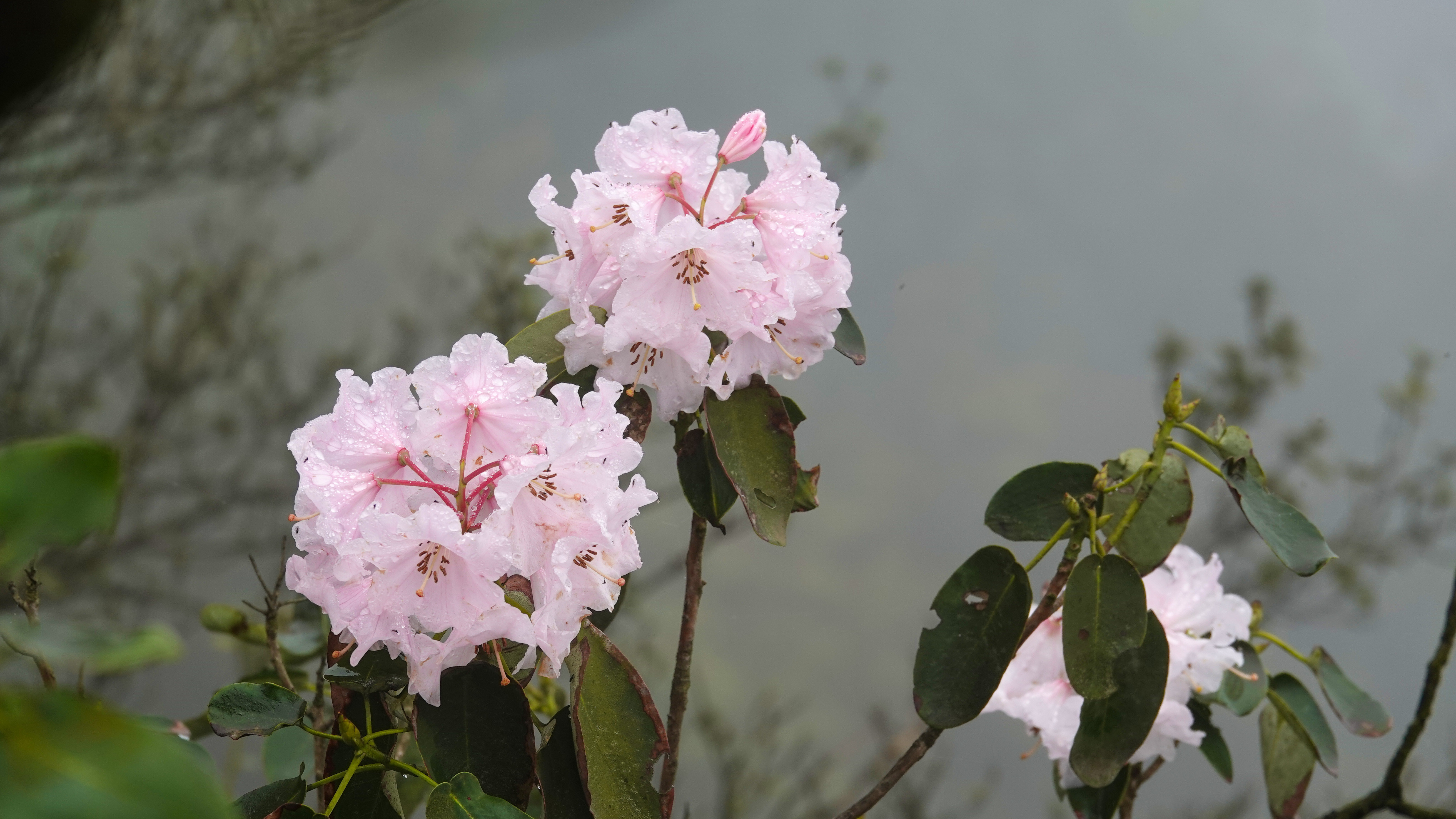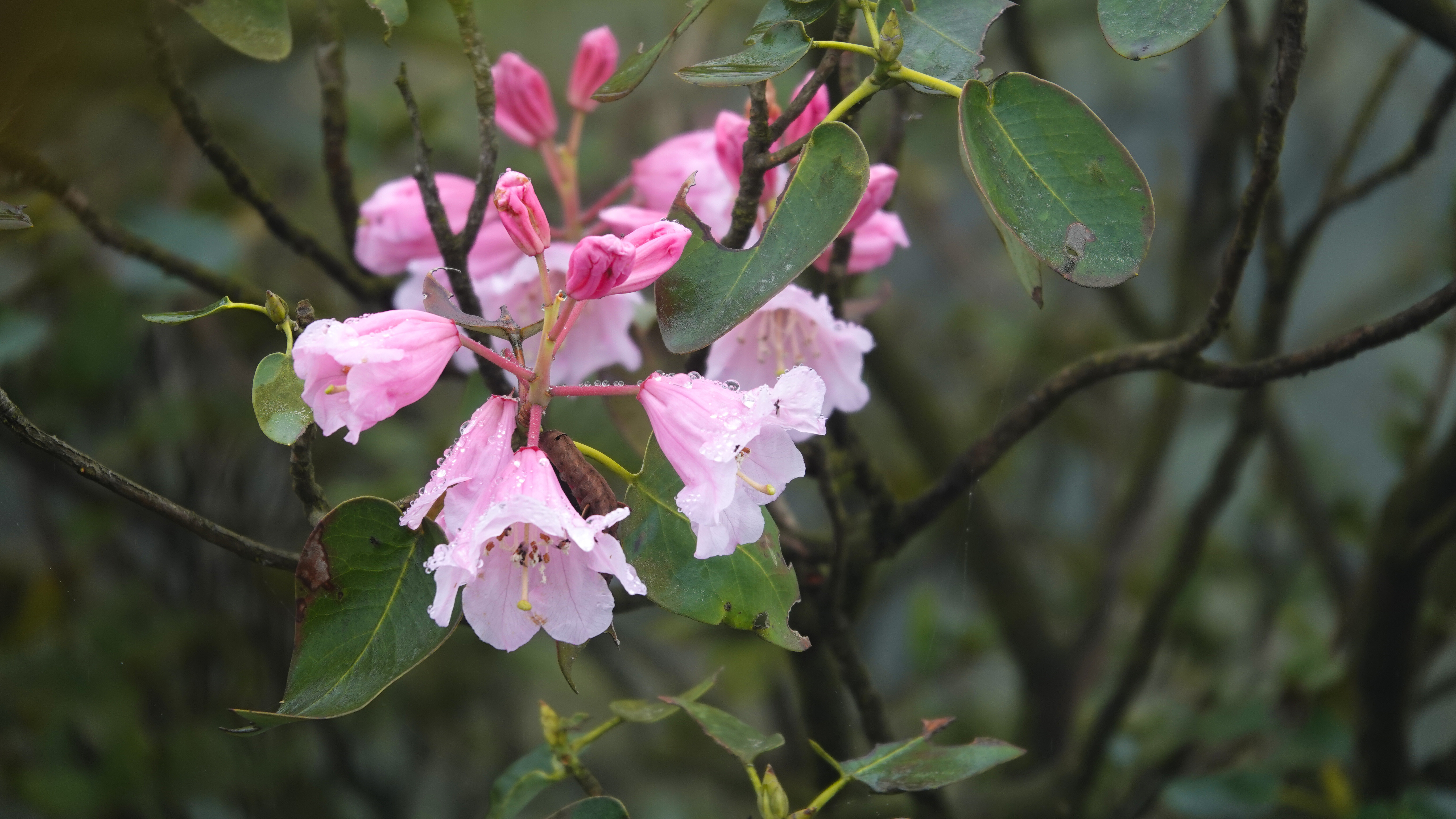 睡莲叶杜鹃是杜鹃花科杜鹃属的珍稀植物,已被列入《世界自然保护联盟红色名录》,保护级别为濒危。它们主要栖息于陡坡悬崖山脊,对生态环境要求极为苛刻。在黄荆老林,睡莲叶杜鹃虽有一定数量的分布,但总体仍属稀少,每至盛花期,成片绽放的景观难得一见。今年受充沛雨量滋养,花势尤为喜人,雨后花朵更显娇艳。