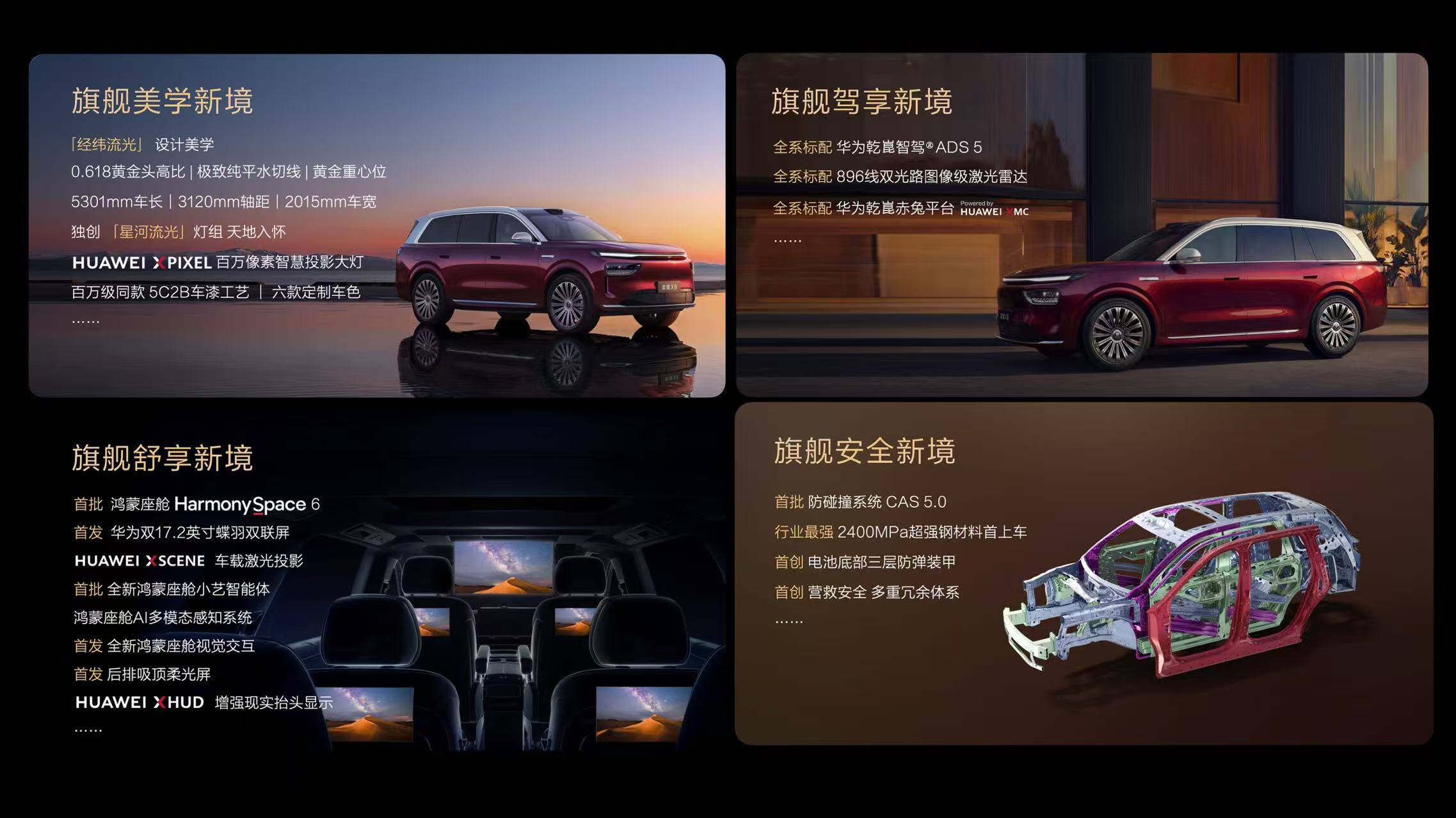 安全层面,奕境X9全系标配华为乾崑最新一代CAS5.0,车身首次量产应用2400MPa超高强度钢,搭配行业首创三层防弹级电池装甲。舒享层面,奕境X9首发全新一代鸿蒙座舱,升级智慧交互体验,让智能座舱成为主动服务用户的智能体,兼顾便捷性与舒适性。驾享层面,奕境X9全系标配华为乾崑智驾ADS 5及896线激光雷达,以全主动预判驾驶能力,重新定义高端车型的驾驶乐趣与操控体验。