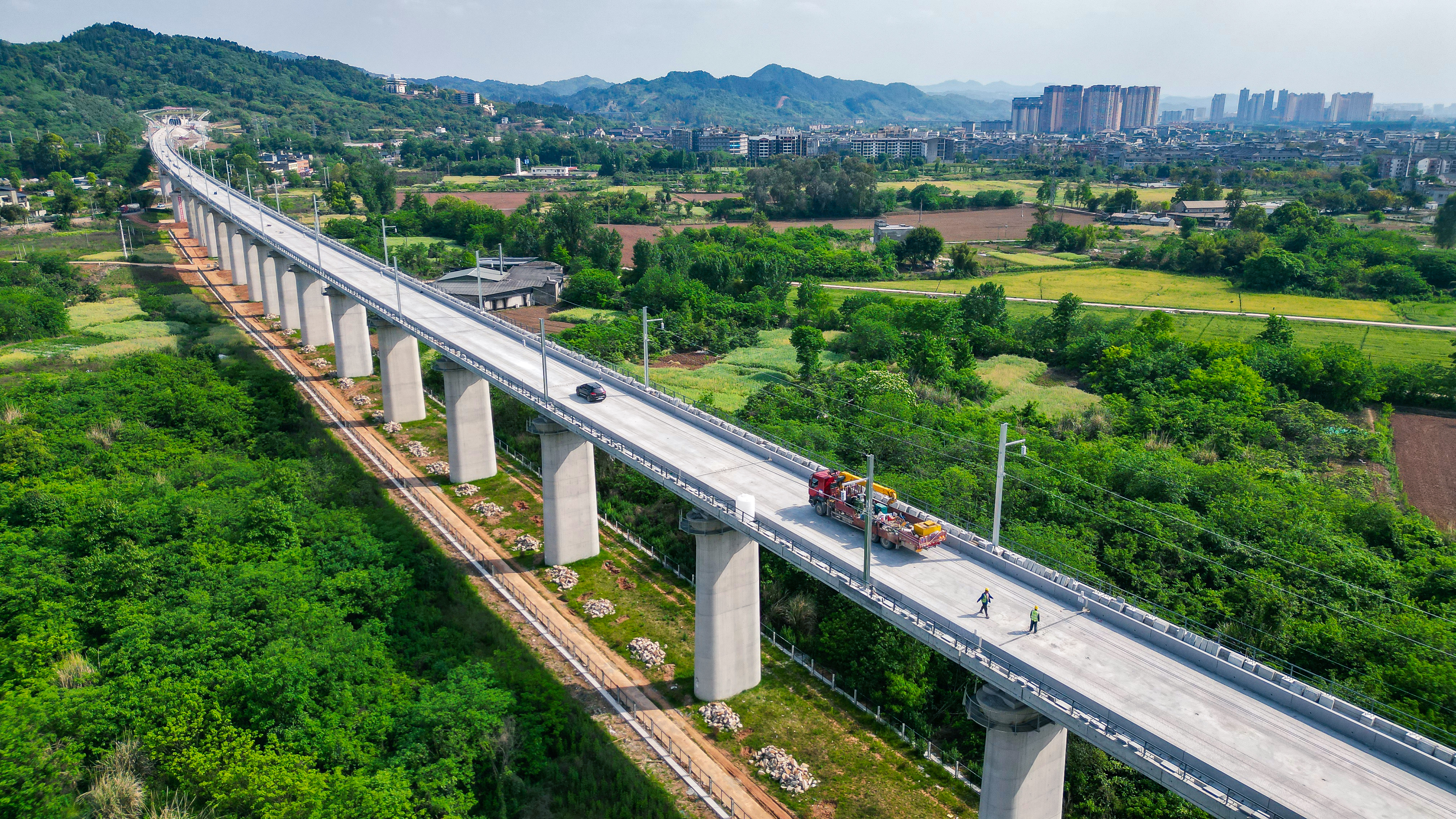 成渝中线高铁建设进入冲刺阶段。4月23日,成渝中线高铁龙泉驿大桥正在进行桥面配套施工。目前四川段的路基工程已完成99.6%,所有桥梁的主体建设已全部完成,全线已进入无砟轨道施工阶段,预计2027年建成通车,成都至重庆的旅行时间将压缩至50分钟左右。(刘晨鸣 摄)