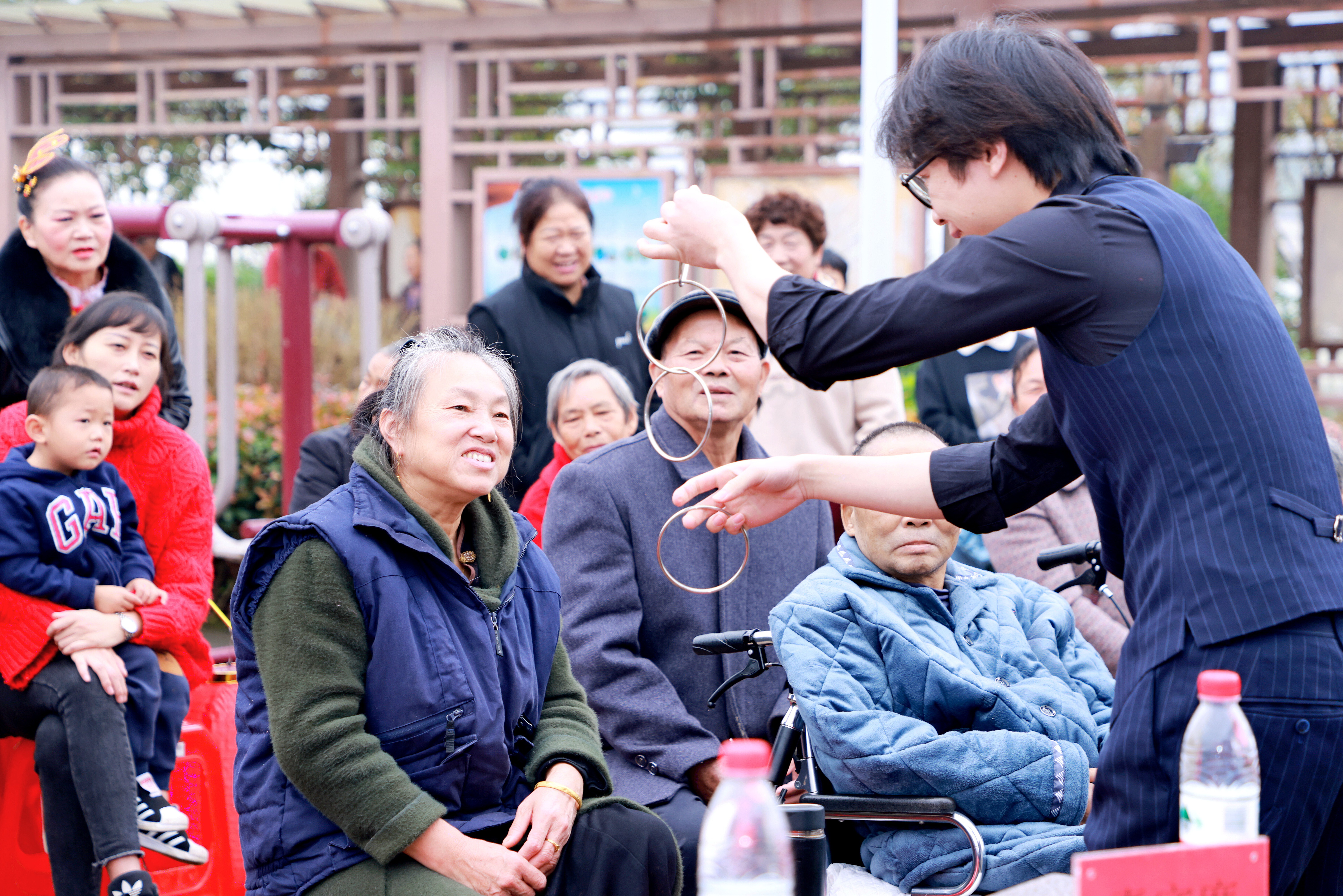 上午9时30分,文艺汇演在舞蹈《喜舞扇韵》中热烈开场。翩跹的舞姿搭配飞扬的彩扇,瞬间点燃全场热情。随后,各类精彩节目轮番登台:《中江表妹》脱口秀用接地气的方言,幽默的段子让现场笑声盖过雨声;健身操《永远是一家》节奏明快,表演者动作整齐划一,尽显新时代村民的精神风貌;魔术《魔法奇迹》的互动环节充满惊喜,引得孩子们惊呼连连;快板《反诈宣传》则以朗朗上口的节奏,将养老诈骗常见手段与防范技巧娓娓道来,让村民在欣赏节目之余学到实用知识......
